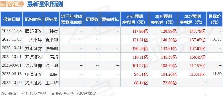 国信证券2025年三季报显示,前三季度公司主营收入192.03亿元,同比上升69.41%;归母净利润91.37亿元,同比上升87.28%;扣非净利润91.33亿元,同比上升88.02%;其中2025年第三季度,公司单季度主营收入81.28亿元,同比上升101.11%;单季度归母净利润37.7亿元,同比上升116.65%;单季度扣非净利润37.6亿元,同比上升117.33%;负债率77.3%,投资收益82.0亿元。