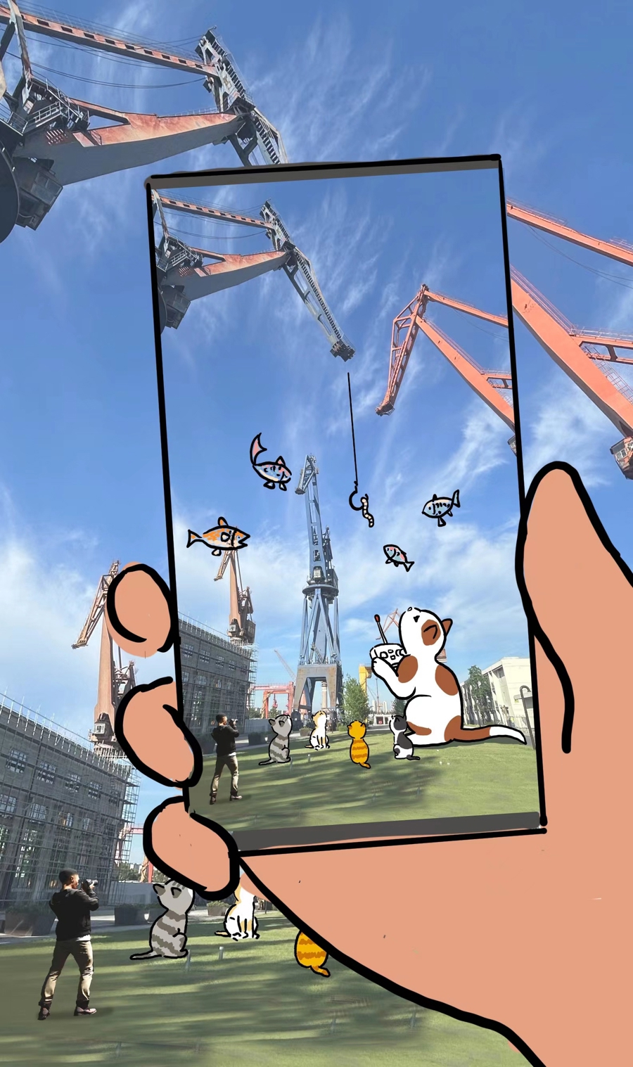 步入船台公园,三座斑驳的巨型塔吊之下,一只巨型猫咪气膜首当其冲地抓住所有来客的视线。这只猫咪近10米高,手持一台红色遥控手柄,仰头望天,仿佛在认真地操作着什么。在它的身旁,同样在仰头望天的四只小猫,仿佛正在围观巨型猫咪操作着塔吊。顺着它们的视线向上望去,眼前的三座巨型塔吊瞬间变得更具象化了。
